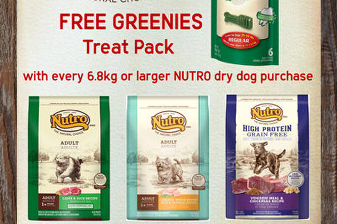 Get a free Greenies treat pack with purchase of Nutro 6.8kg and over.