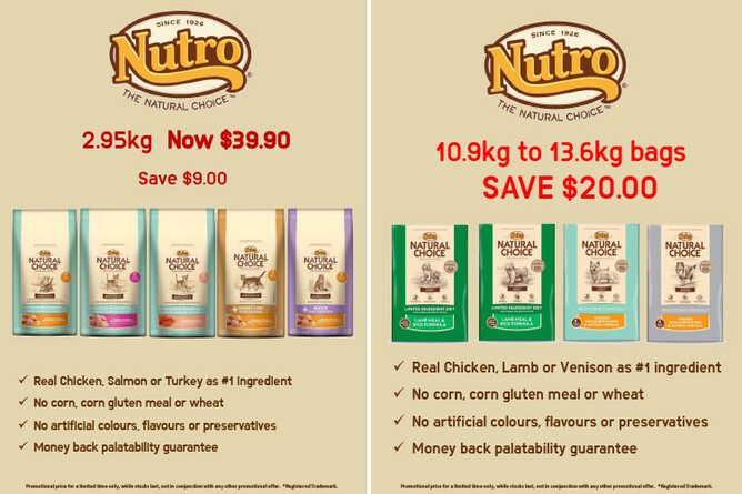 We’ve got a great deal on cat food at $39.90 for 2.95kg, or save $20 on 10.9kg to 13.kg bags of dog food! With a variety of dog and cat food, the Nutro range is dedicated to providing exceptional nutrition by using only the best natural ingredients.