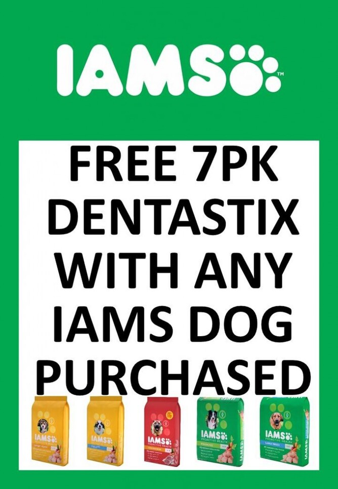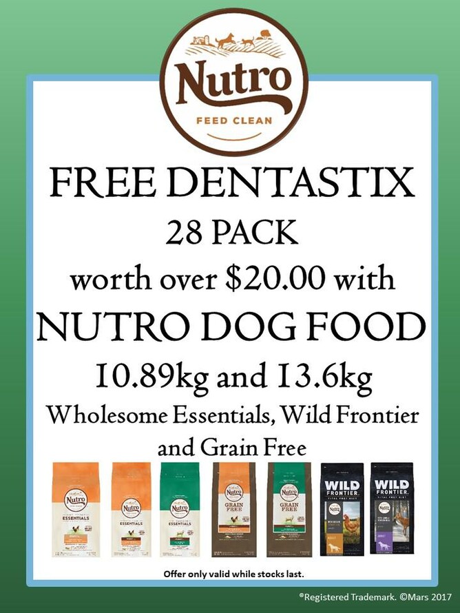 We’re giving away free Dentastix this month – receive a free 7-pack with any purchase of IAMS dog food, and receive a whopping 28-pack of Dentastix with any 10.89kg or 13.6kg bag of Nutro!
