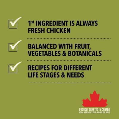 Fresh chicken (13%), chicken meal (13%), whole red lentils, whole green peas, whole chickpeas, fresh chicken giblets (liver, heart) (6.5%), turkey meal (6.5%), chicken fat (6%), fresh eggs (4%), raw hake (4%), lentil fibre, pea starch, fish oil (3%), whole green lentils, whole yellow peas, herring meal (3%), raw turkey livers (1%), salt, dried kelp, fresh whole apples, fresh whole butternut squash, fresh whole carrots, fresh whole pears, fresh whole pumpkin, fresh whole zucchini, dried chicory root, fresh beet greens, fresh kale, fresh spinach, fresh turnip greens, whole blueberries, whole cranberries, whole saskatoon berries, burdock root, lavender, marshmallow root, milk thistle, rosehips, turmeric.